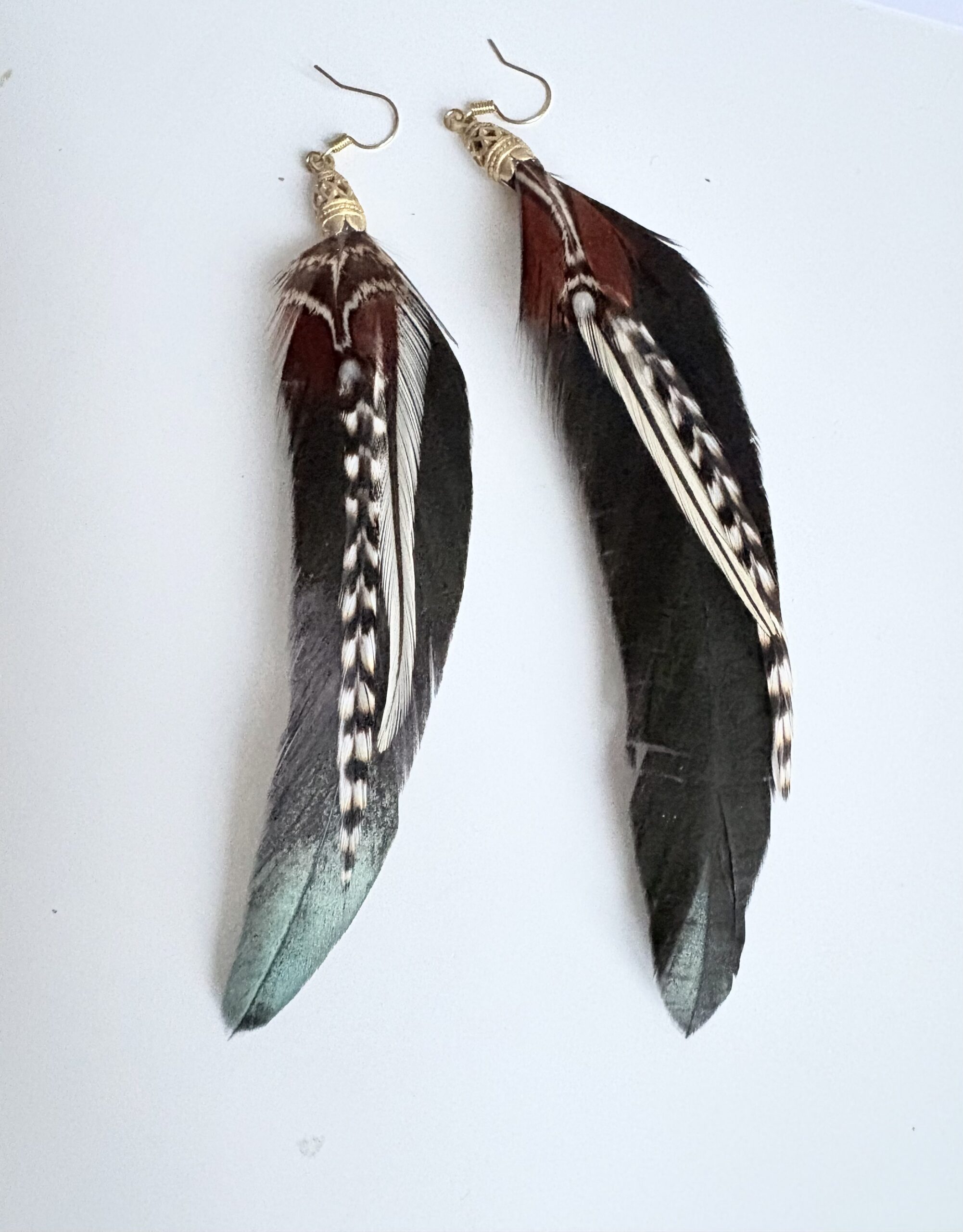 Echte Hahnenfedern und Fasanen Federn, aus Messing.