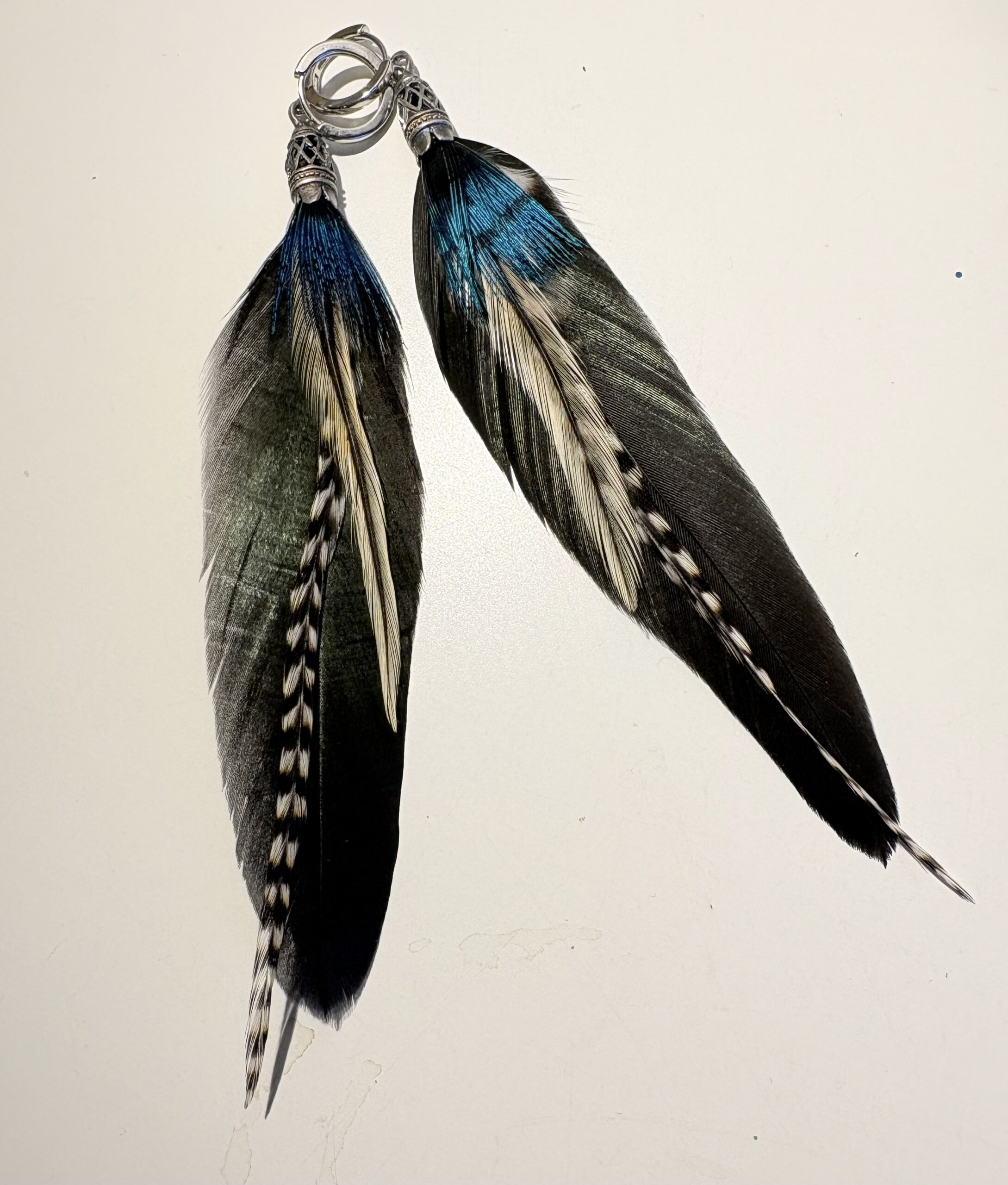 Echte Hahnenfedern und Pfauen Federn, aus Messing versilbert.