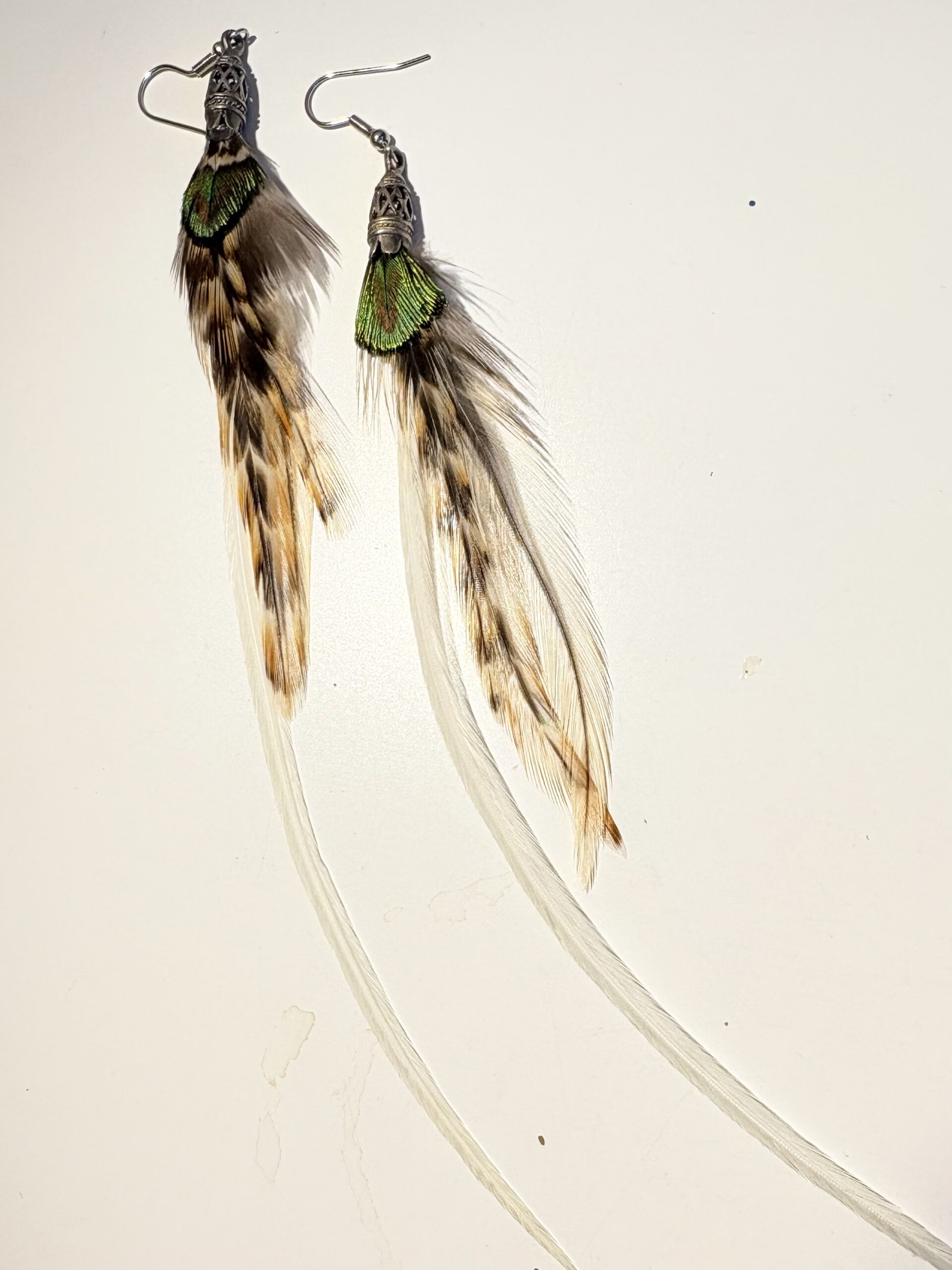 Echte Hahnenfedern und Pfauen Federn, aus Messing versilbert.