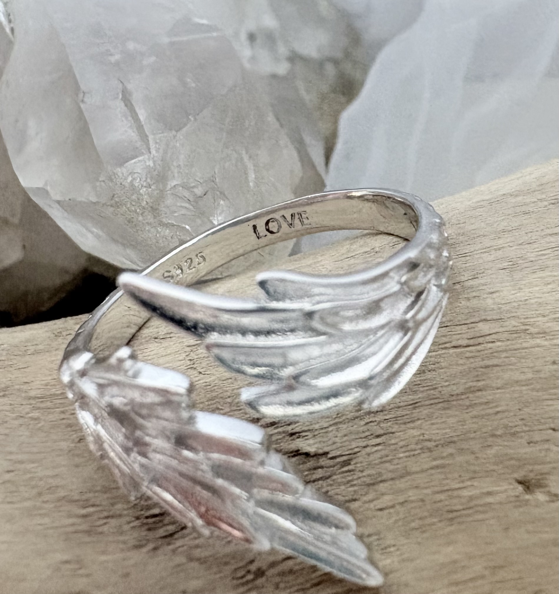 Ring in Silber, offen und in der Grösse verstellbar. Schöne Engelsflügel. Mit unserem registrierten LOVE Stempel versehen