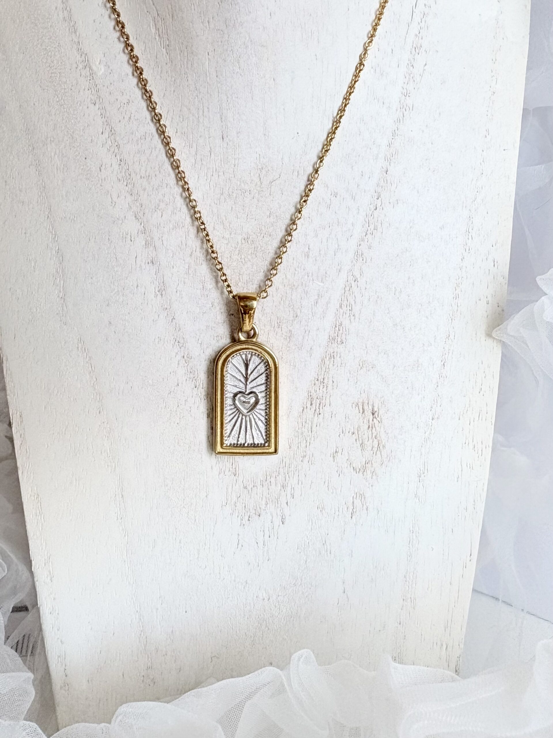 Ein Herz, wie ein Fenster, zweifarbig. Aus Edelstahl und wasserfest mit 18K vergoldet. Kette ist 41cm + 5cm Verlängerung.