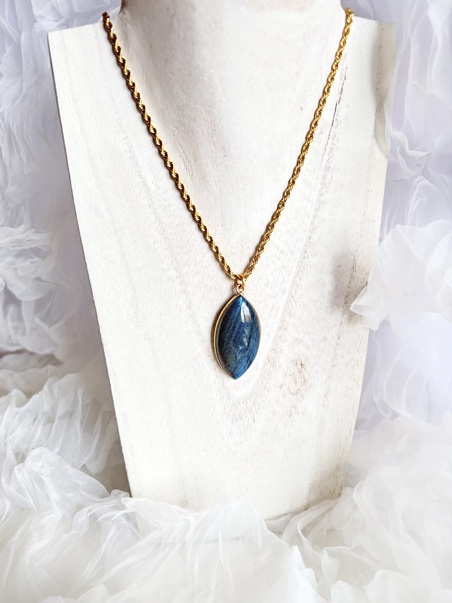 Ein sehr schöner blau schillender Labradorit in marquisenform. In silber vergoldet gefasst mit einer Kette aus Edelstahl und wasserfest vergoldet.