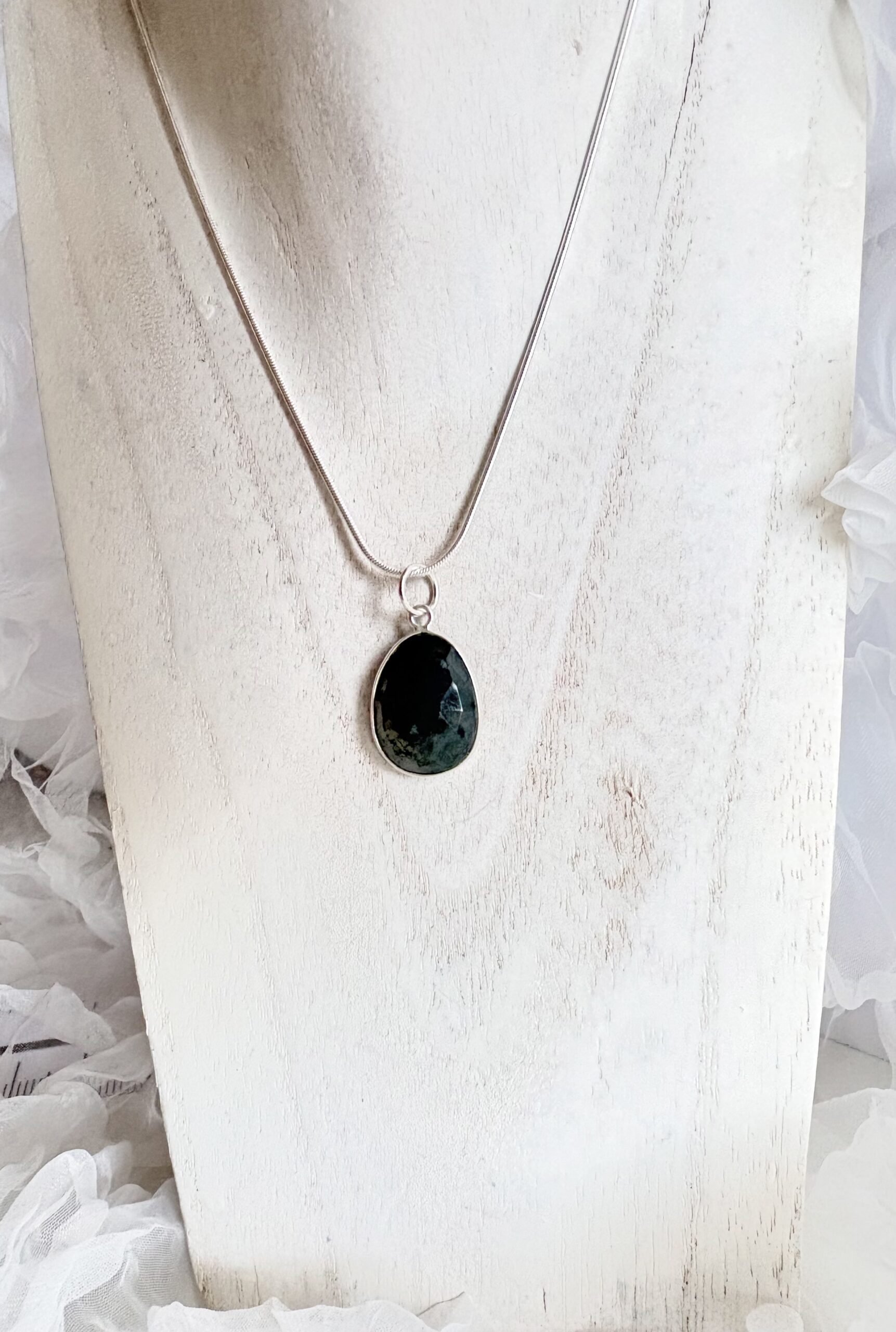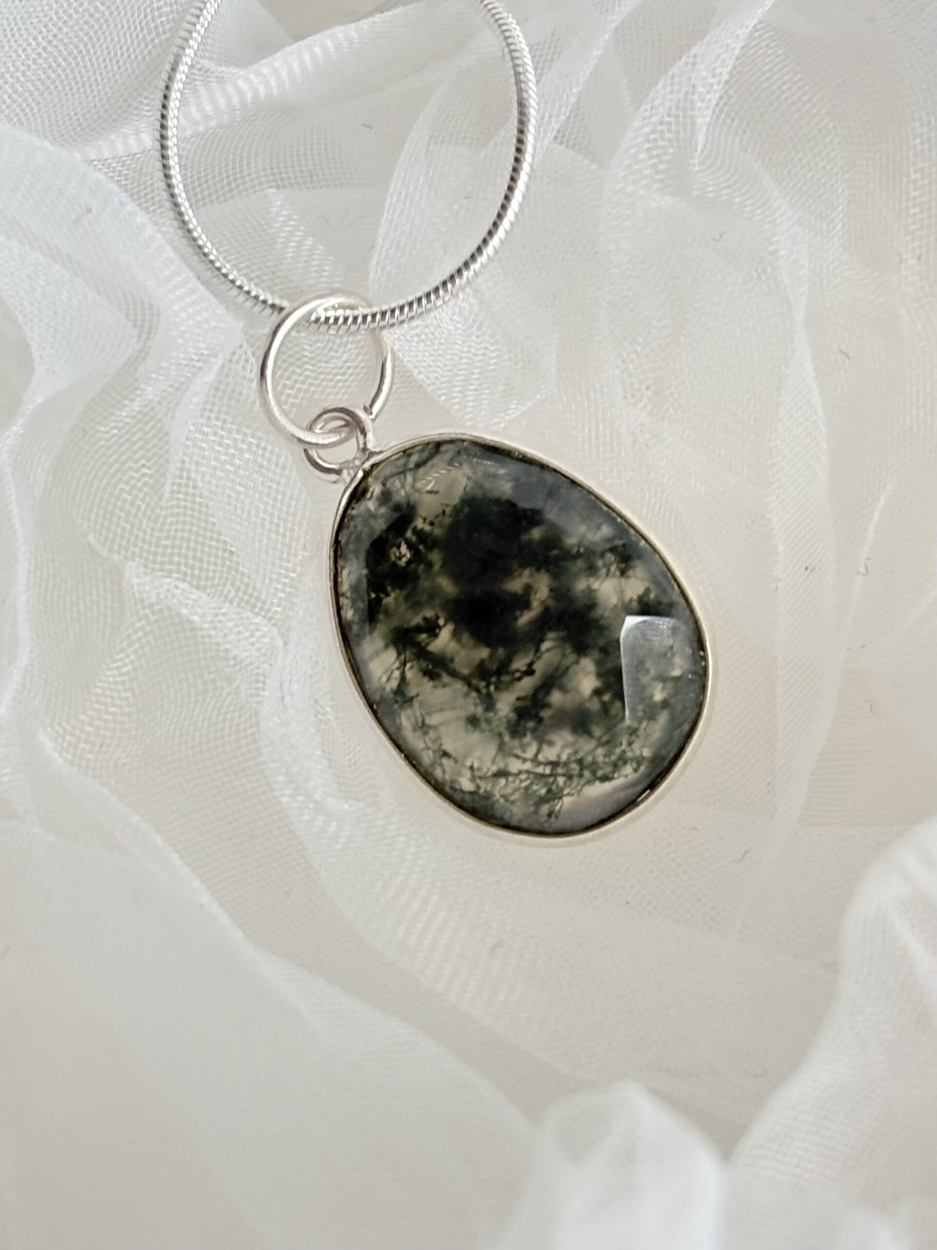 Ein schöner Moosachat in Silber gefasst und an einer Schlangen Kett in Silber.