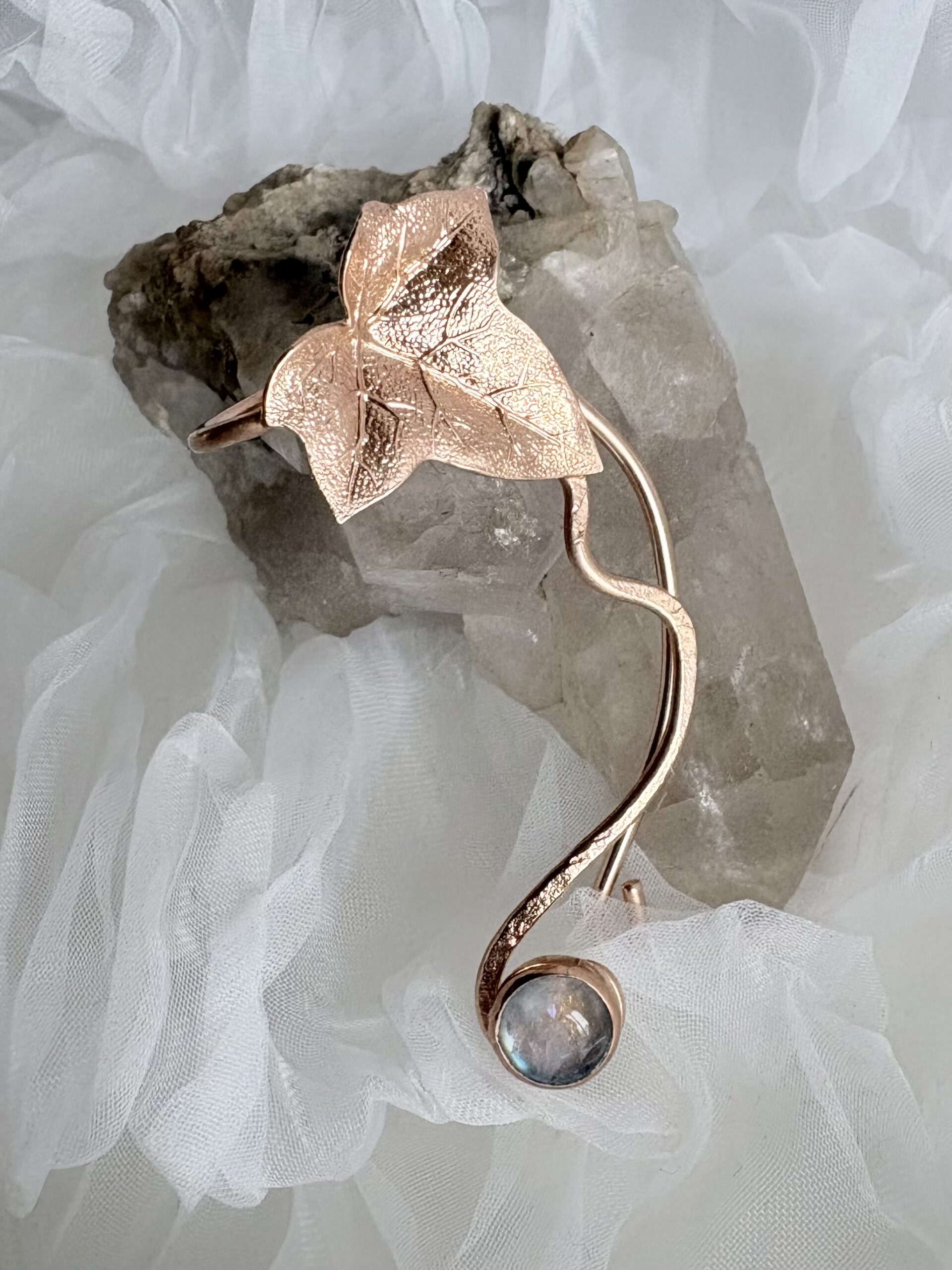 Dieses Schmuckstück ist mit einem Efeu Blatt aus dem Jugendstil und einem Mondstein verziert. Ist verstellbar und braucht kein Loch.