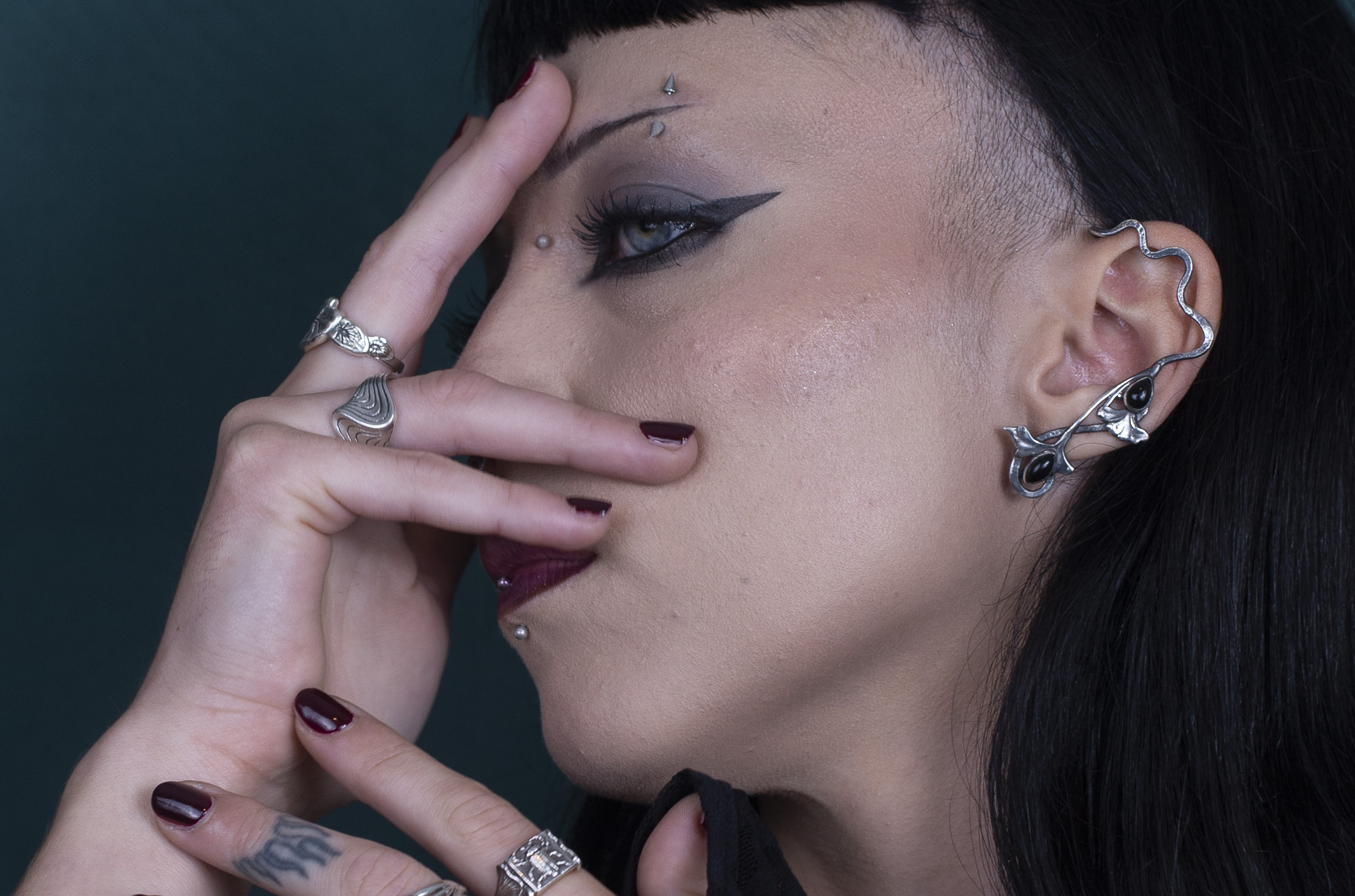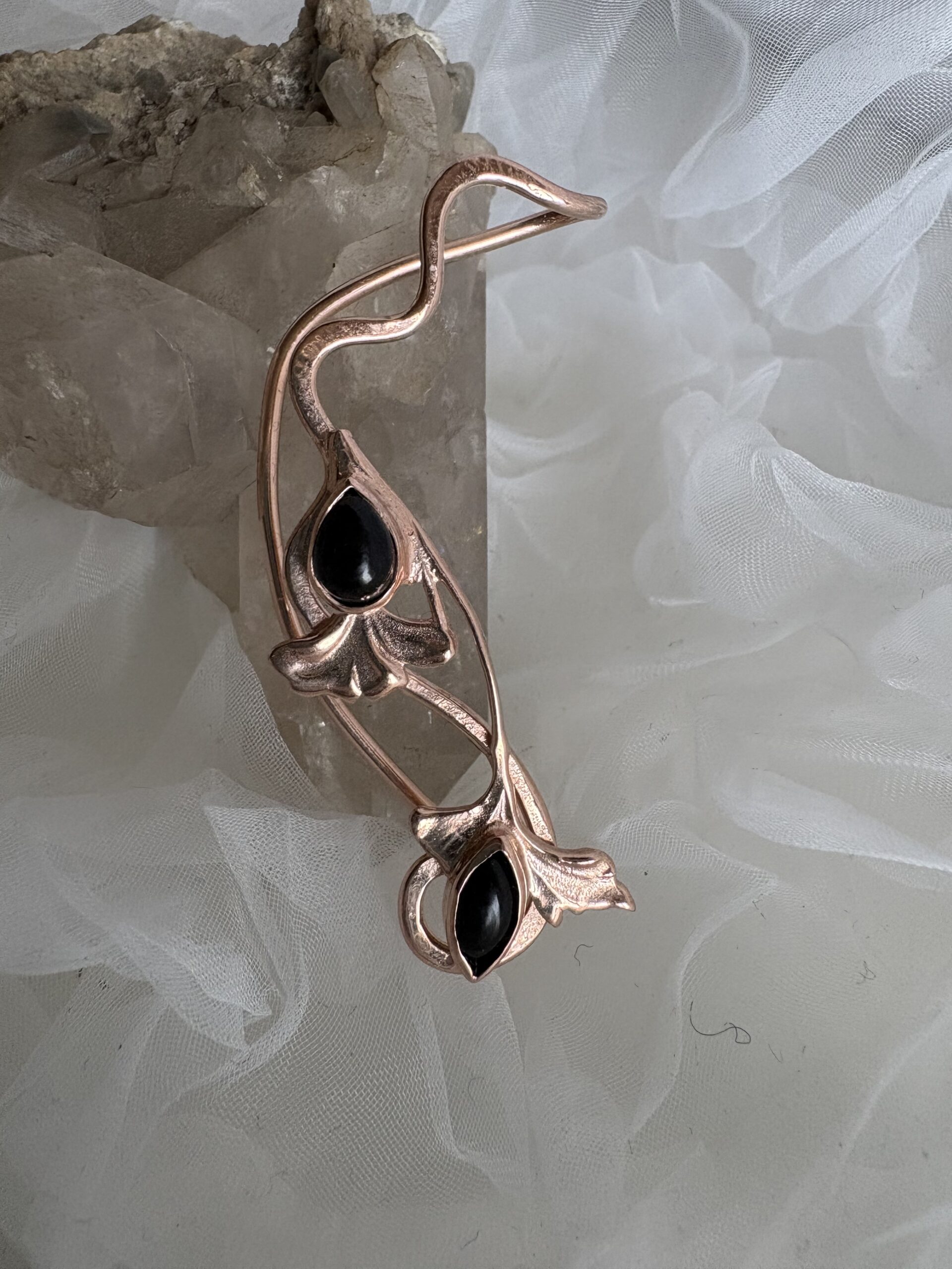 Dieses Schmuckstück ist mit Ginkgo Blättern aus dem Jugendstil und zwei Onyx verziert. Ist verstellbar und braucht kein Loch.