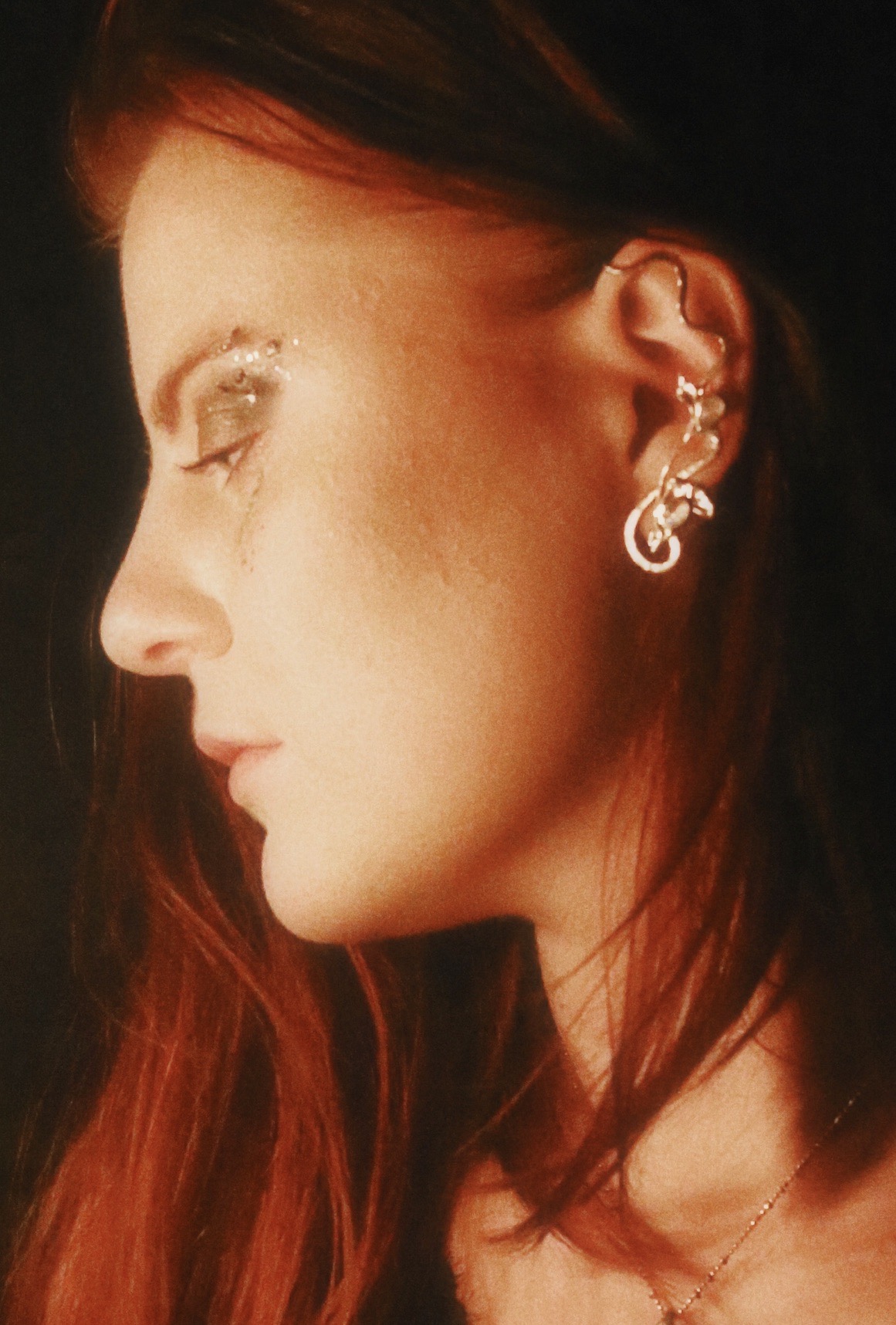 Dieses Schmuckstück ist mit einem Ginkgo aus dem Jugendstil gefertigt und mit zwei Onyx Steinen verziert. Ist verstellbar und braucht kein Loch. Messing versilbert und geschwärzt. Für ein normal grosses Ohr. links