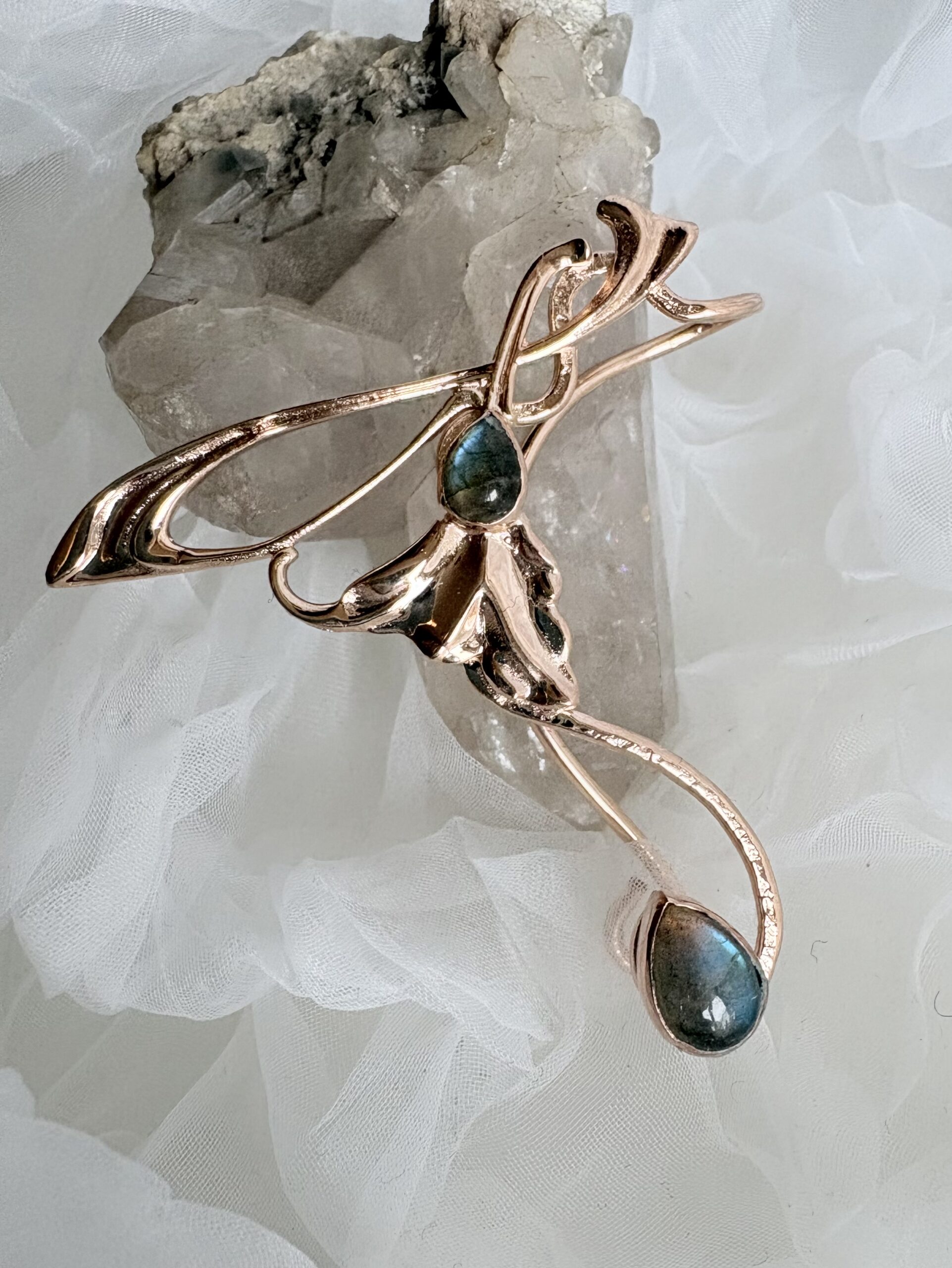 Dieses Schmuckstück ist mit einer schönen Jugendstil Form gefertigt und einem Labradorit Stein verziert. Ist verstellbar und braucht kein Loch. In roségold vergoldet. Grundmaterial messing. Für rechts. Eher für ein kleines Ohr.