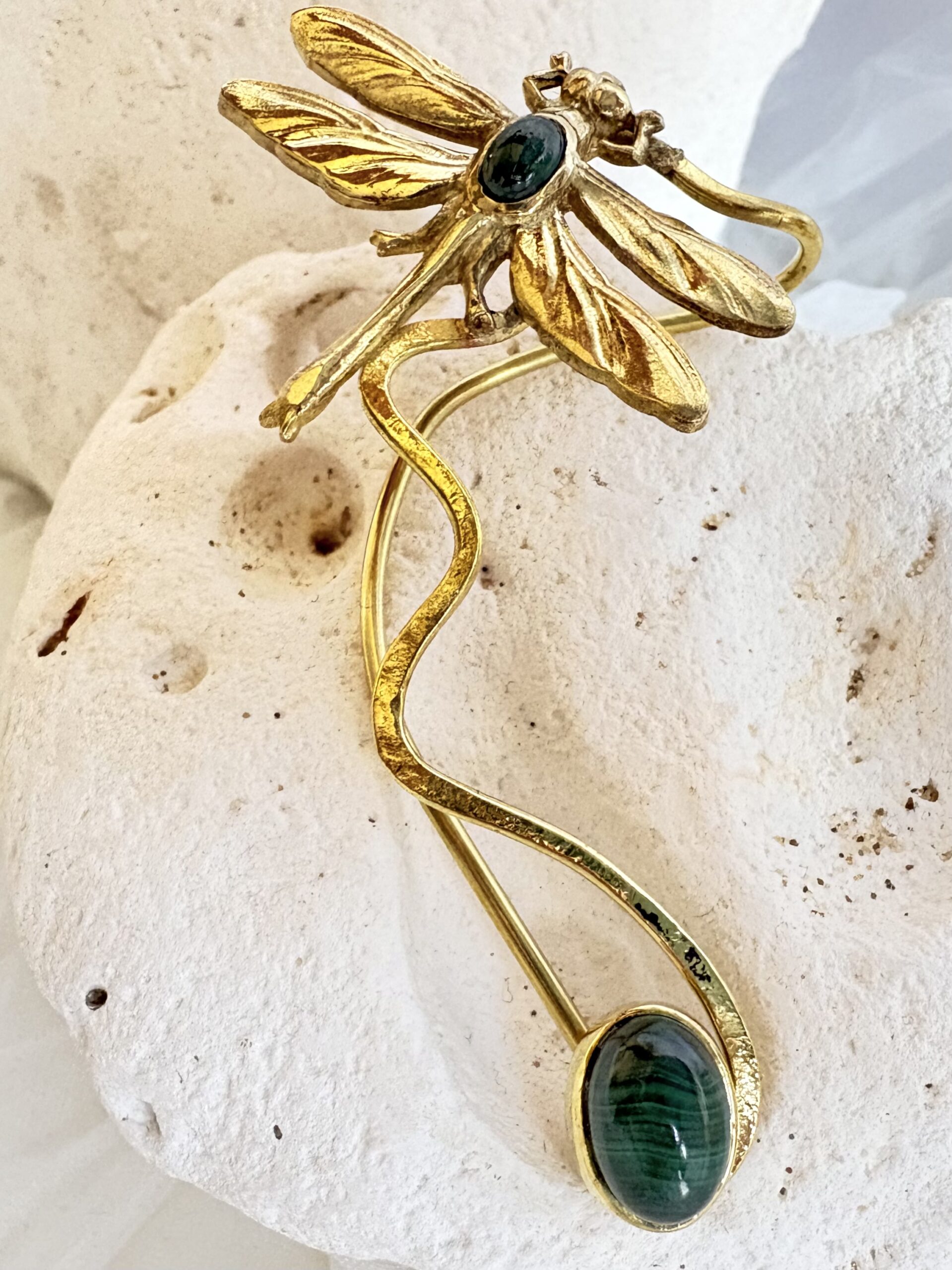 Dieses Schmuckstück ist mit einer Libelle aus dem Jugendstil und einem zwei Malachit Steinen verziert. Ist verstellbar und braucht kein Loch.
