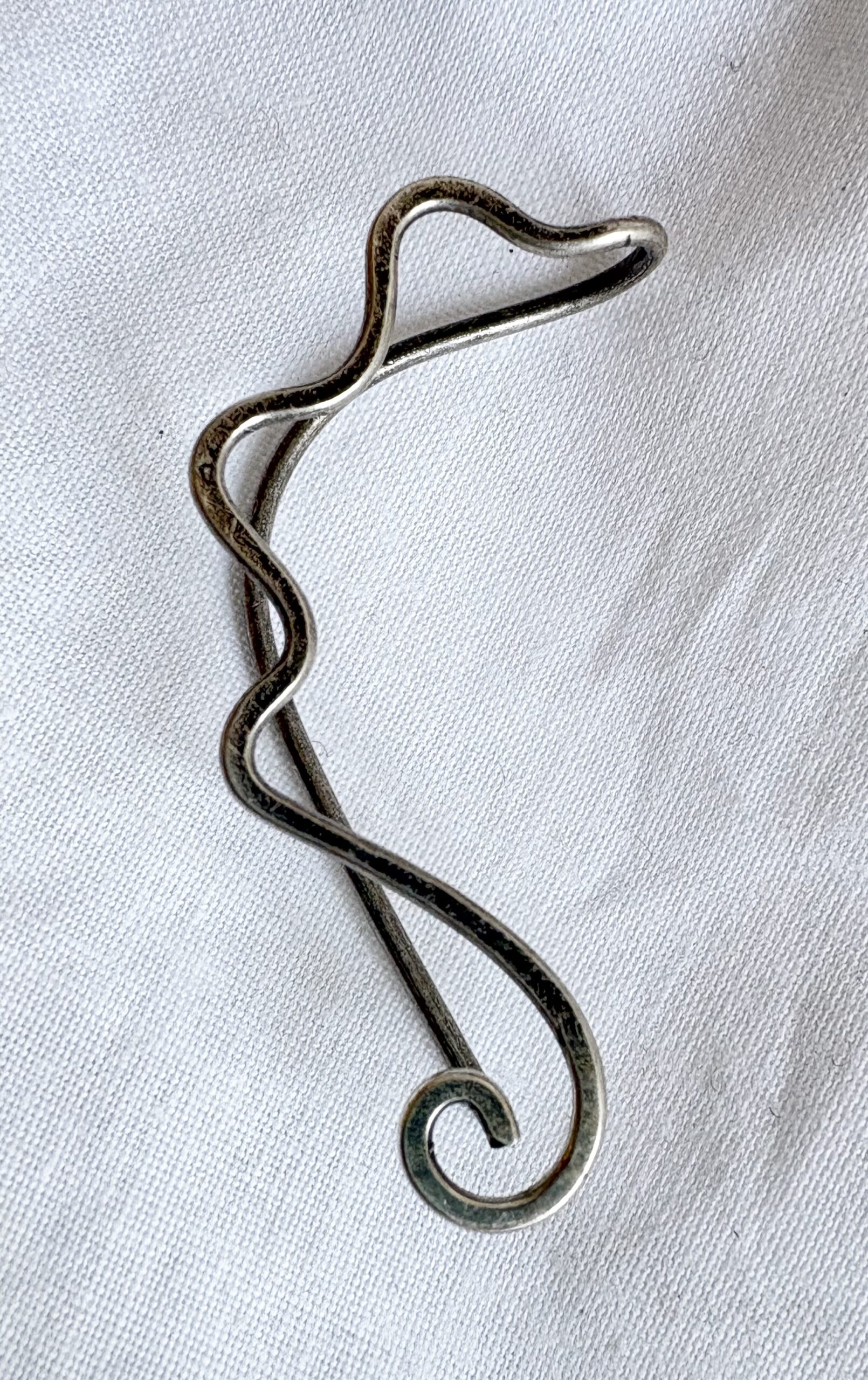 Ein Ohrschmuck aus Draht von Hand gefertigt und geschmiedet. Aus Messing und versilbert. Für Rechts.