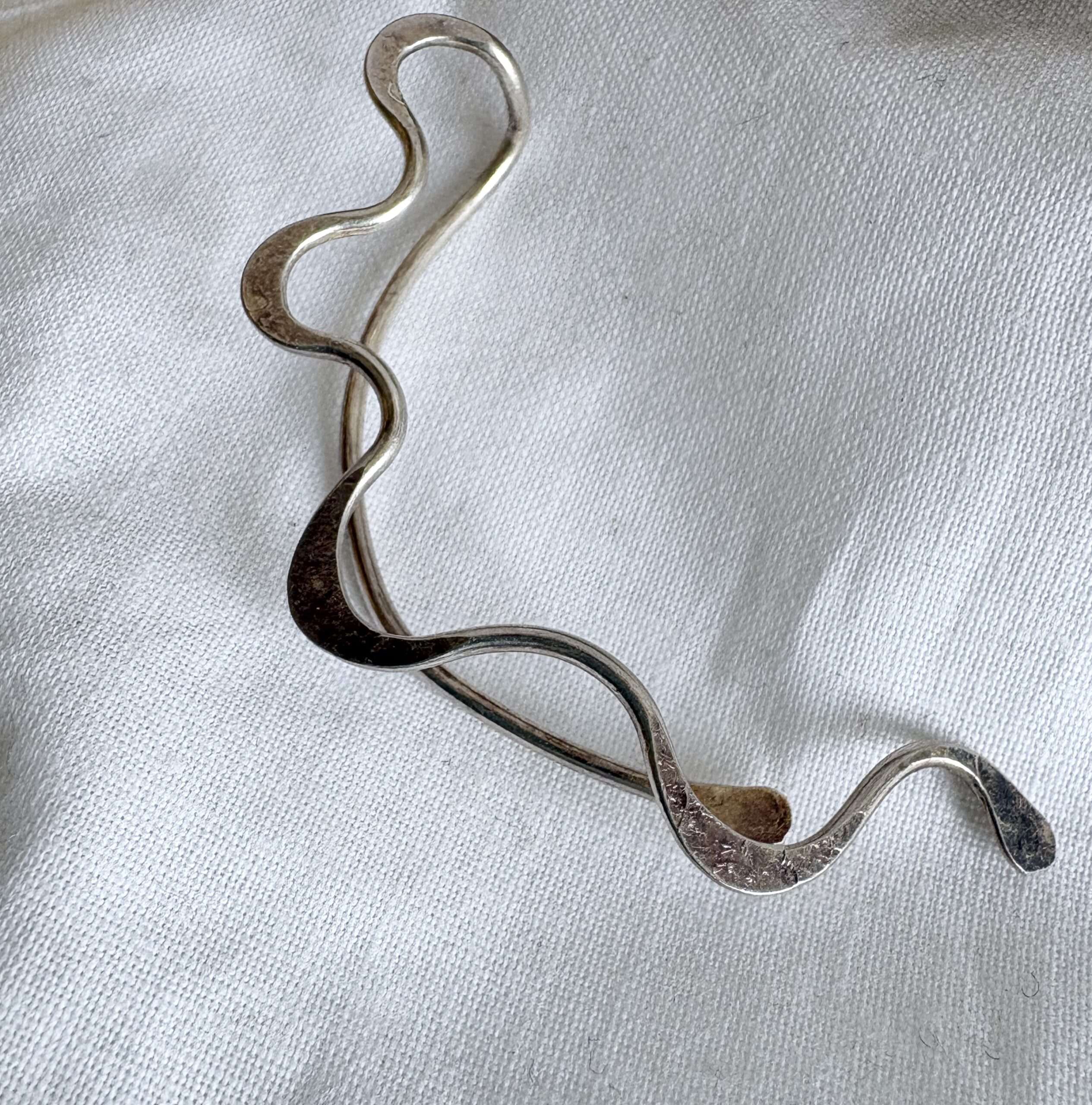Ein Ohrschmuck aus Draht von Hand gefertigt und geschmiedet. Aus Messing und versilbert. Für Rechts.