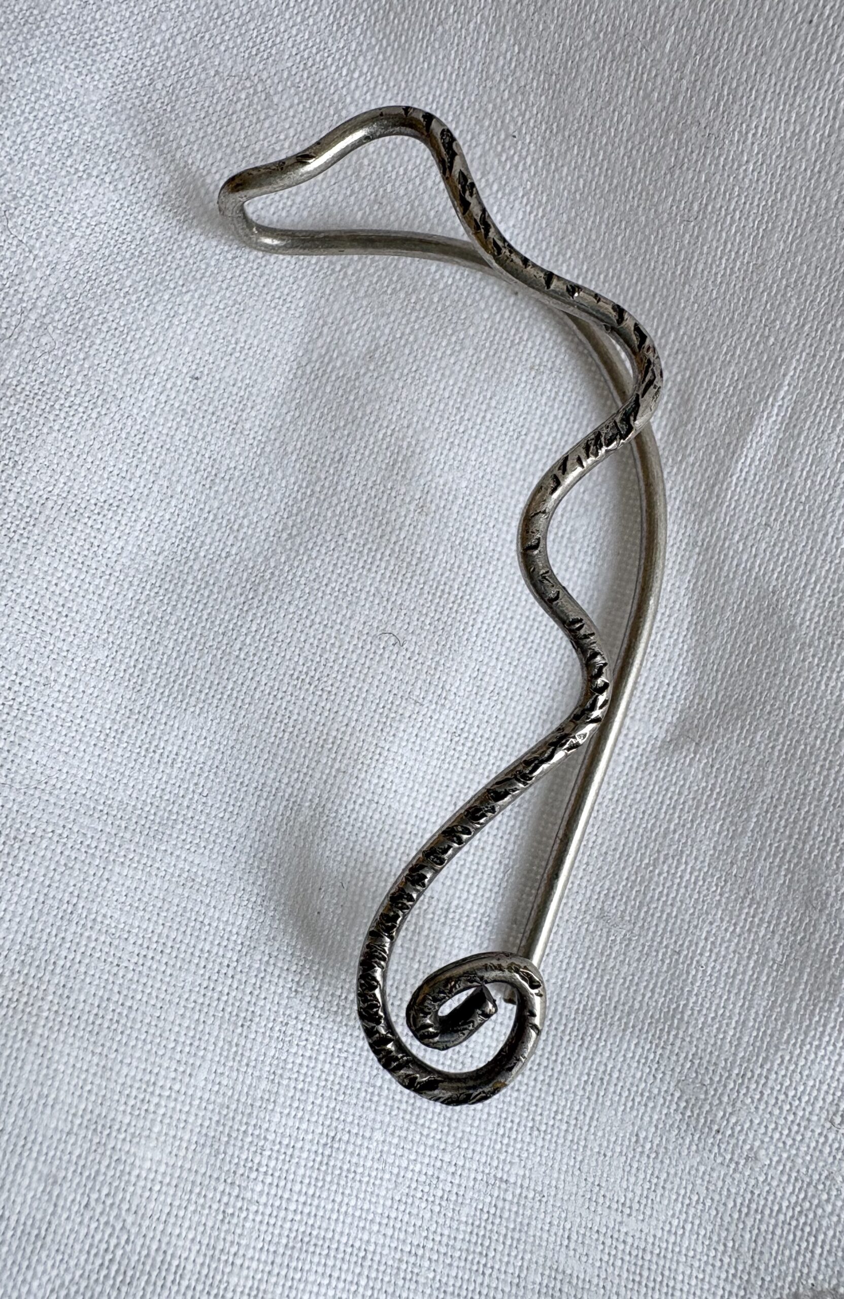 Ein Ohrschmuck aus Draht von Hand gefertigt und geschmiedet. Aus Messing und versilbert. Für Links.