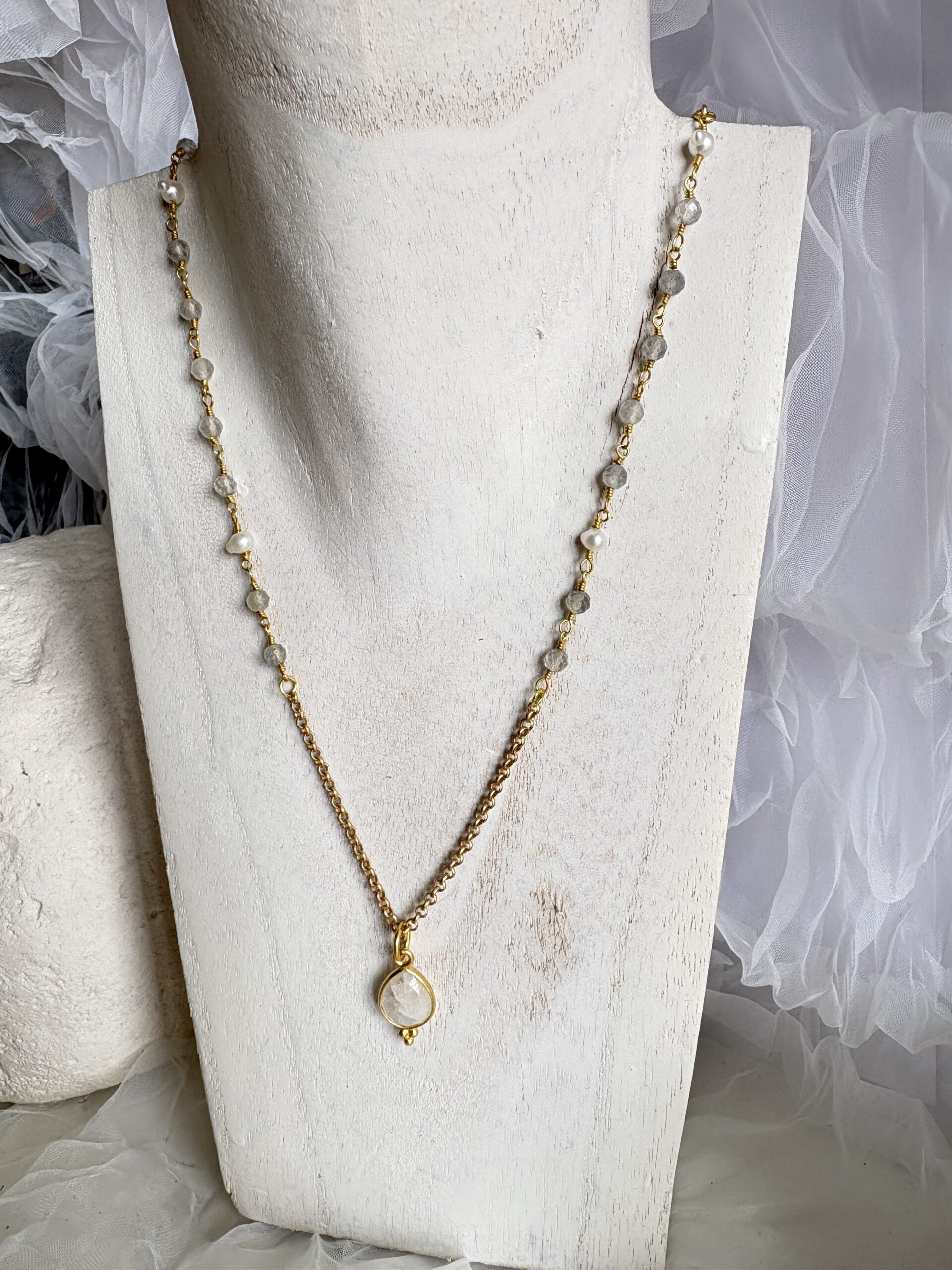 Kette Regenbogen Mondstein und Perlen, Anhänger Regenbogen Mondstein / Einzelstück