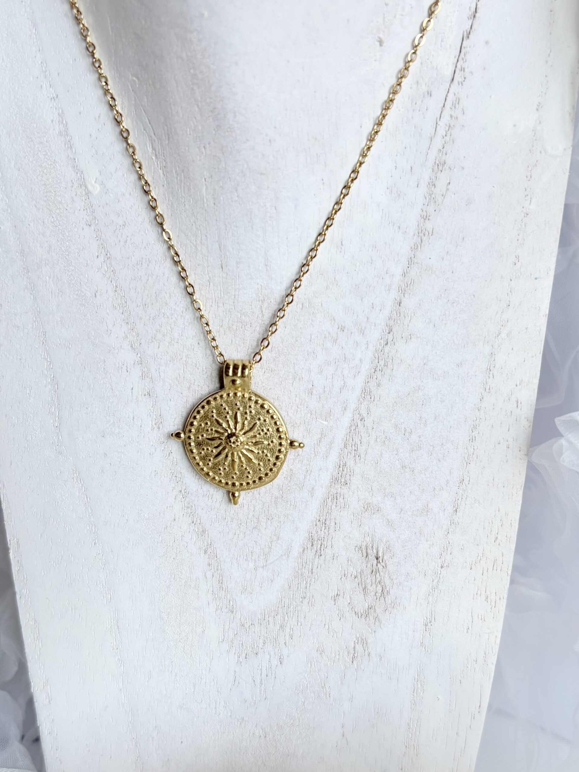 Eine Sonne, die auch die 4 Himmelsrichtungen vereint in diesem Schmuckstück, ein Ursymbol und die älteste Gottheit der Menschen. Aus Edelstaht und wasserfest mit 18K vergoldet. Beidseitig. Die Kette ist 41cm lang + 5cm Verlängerung.