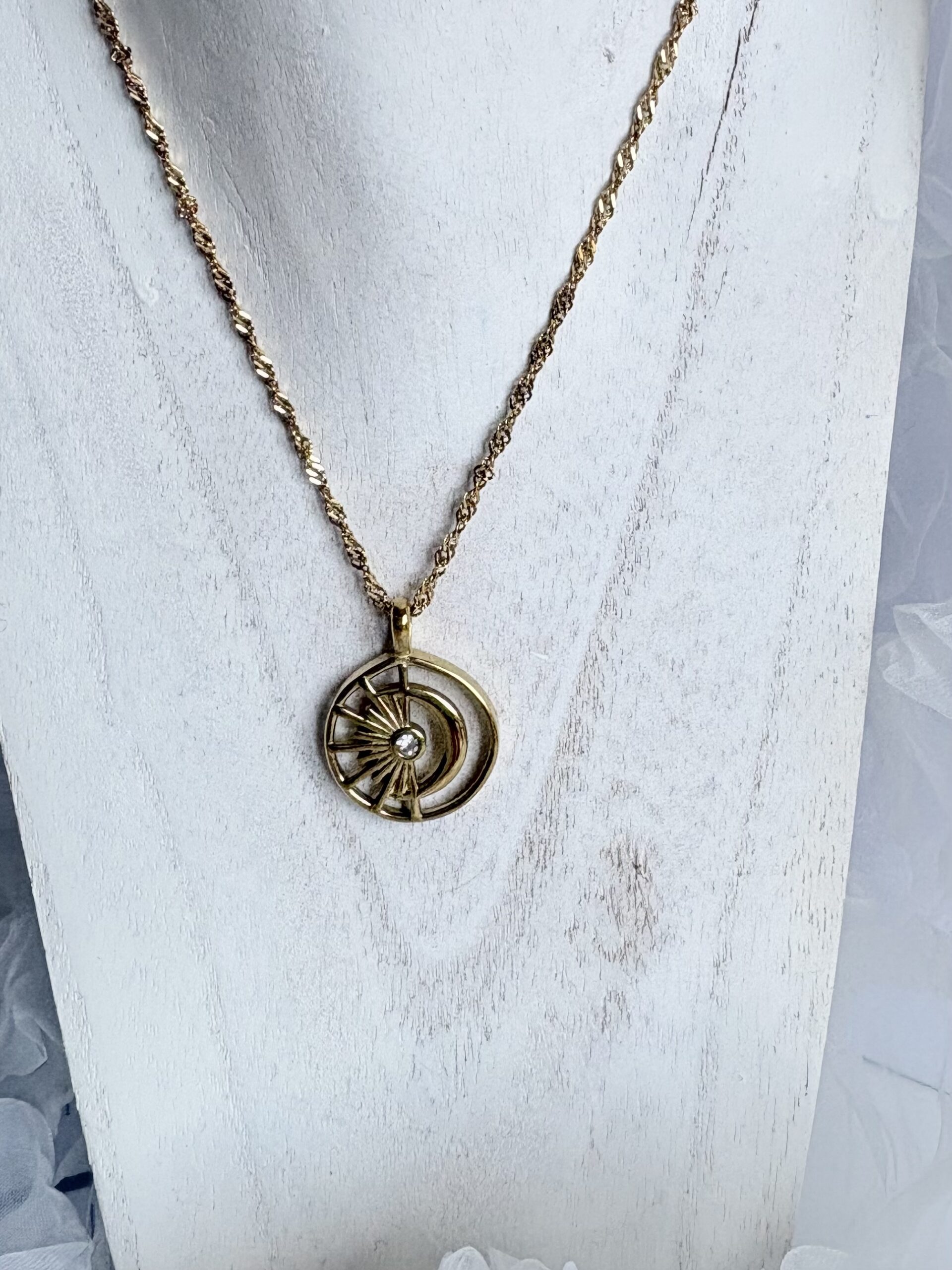 Ein Amulett mit Sonne, Mond und Stern. Aus Edelstaht und wasserfest mit 18K vergoldet mit einem Zirkon als Stern, ein Diamant aus dem Labor, was heutzutage Nachhaltig ist. Die Kette ist 41cm lang + 5cm Verlängerung.